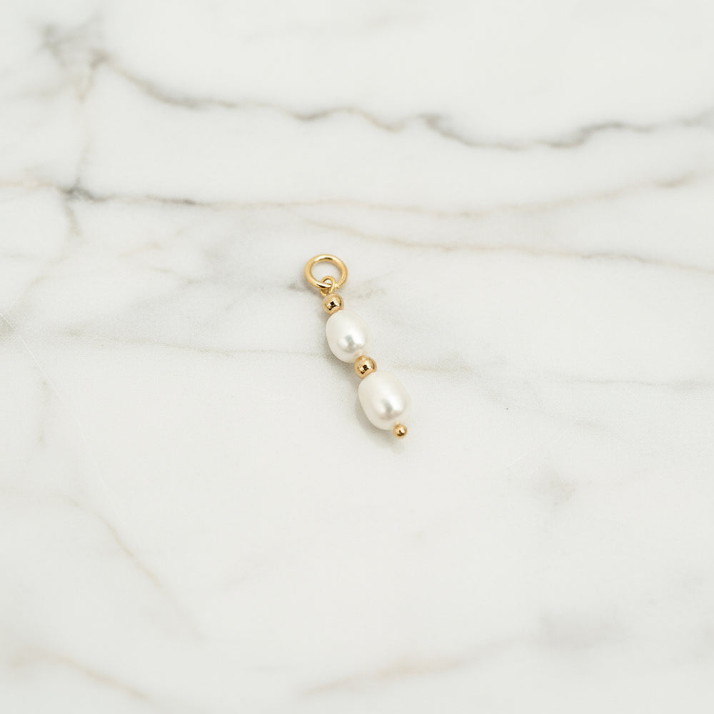 Double the pearls, double the charm. The Double Pearl Charm features two luminous freshwater pearls stacked in perfect balance. Crafted in gold fill, high quality, hypoallergenic, and suitable for everyday wear.