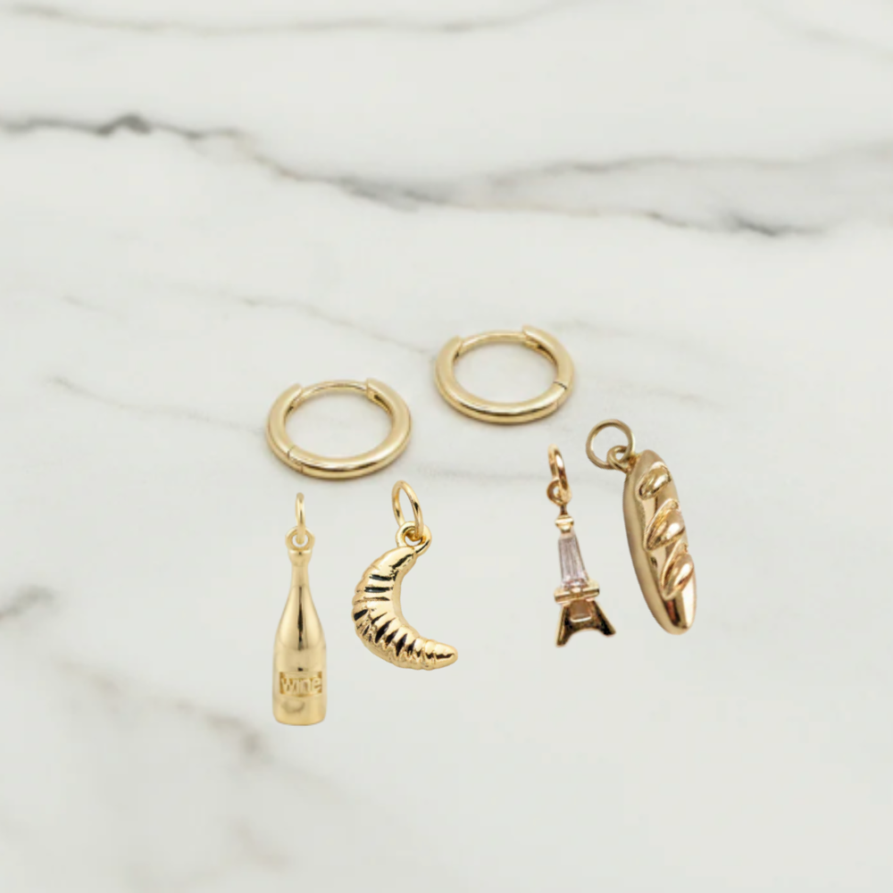 Emily never follows the rules, and neither do we. Inspired by Emily in Paris, we curated an interchangeable earring collection that celebrates bold style and individuality. The "Emily In Paris" Bundle includes one pair of gold earrings and four mix-and-match charms designed to take your ear stack from simple to stunning in seconds. Each charm tells a piece of her story—from Parisian baguettes to Eiffel Tower dreams, champagne nights, and croissant mornings.