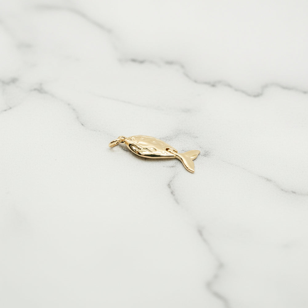 Large fish with modular tail. A coastal-inspired fish charm with delicate details. Crafted in gold fill, high quality, hypoallergenic, and suitable for everyday wear.