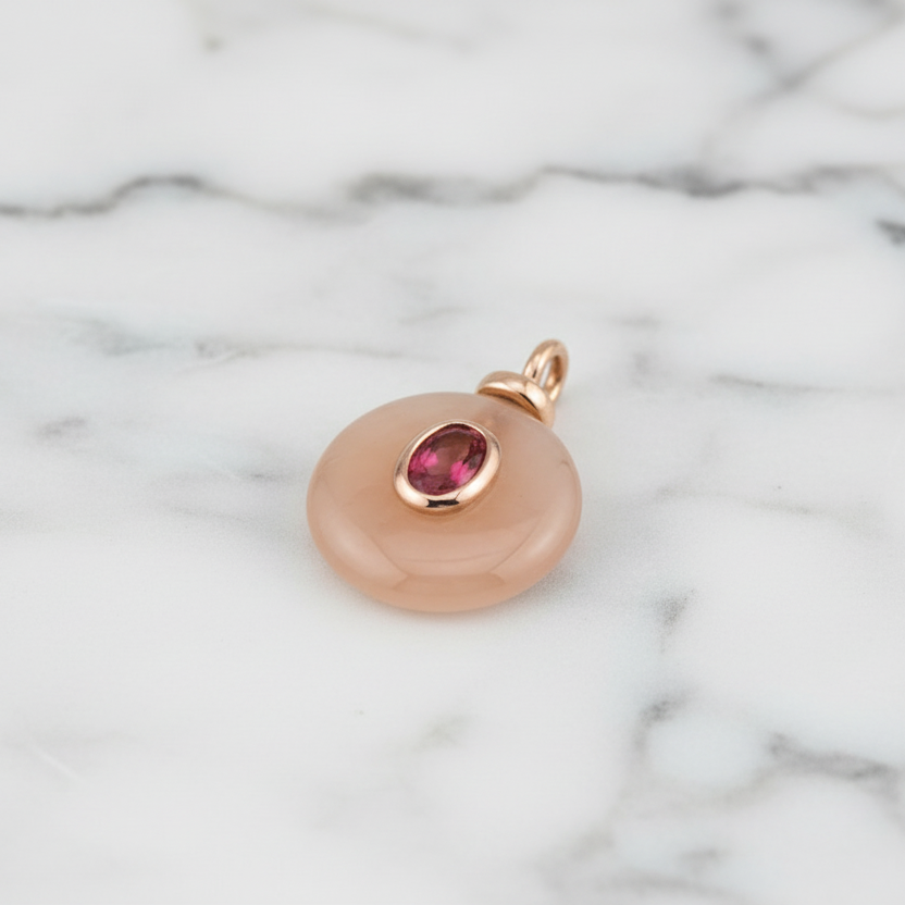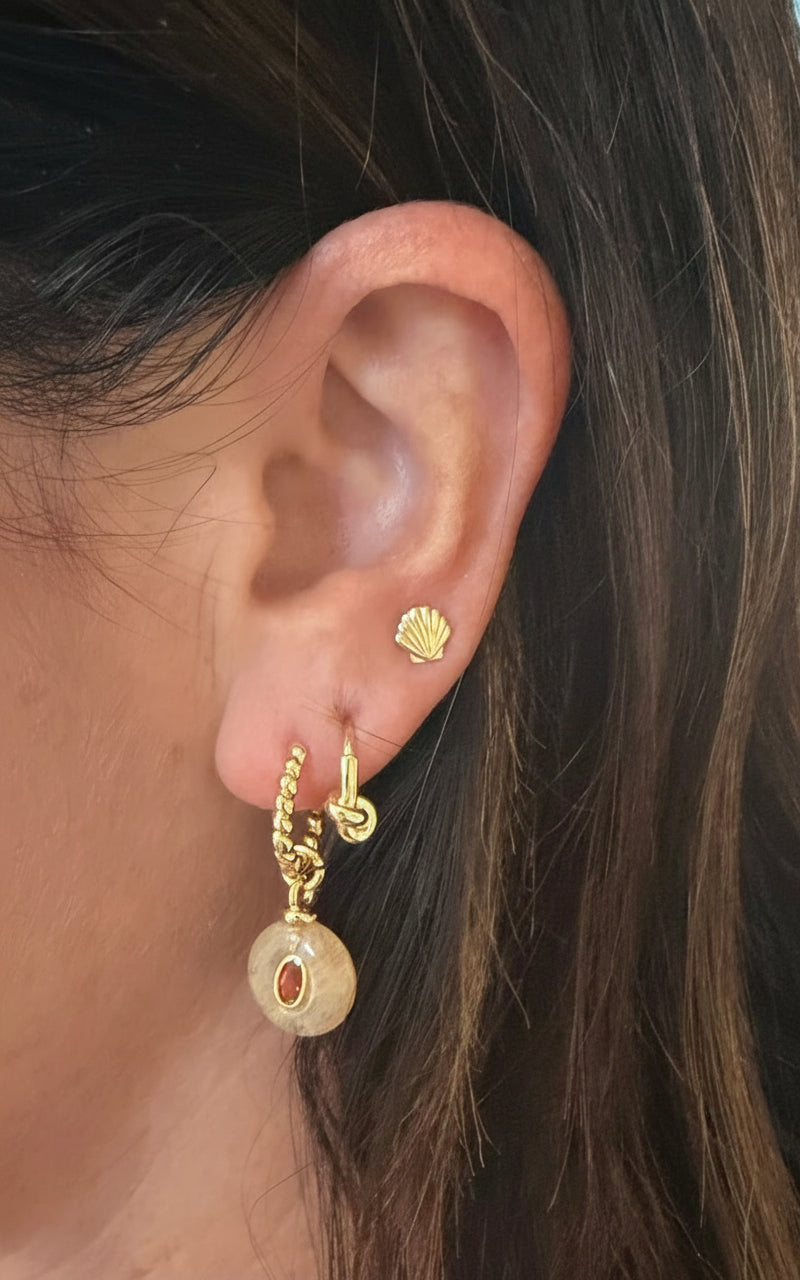 Soft, warm, and glowingly unique — the Peach Stone Medallion Charm brings a touch of natural elegance to your ear stack. Its round, pearlescent peach-toned stone catches the light beautifully, while the faceted oval crystal at the center adds a hint of refined sparkle.