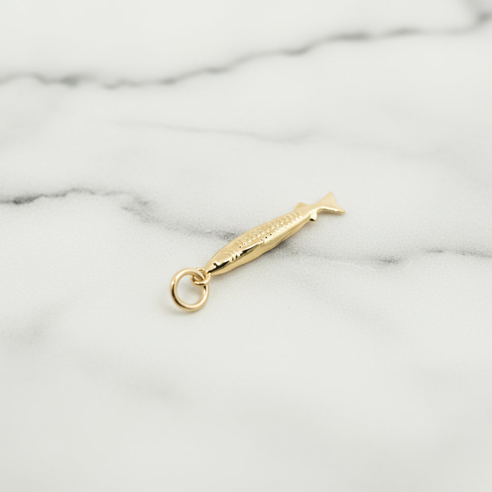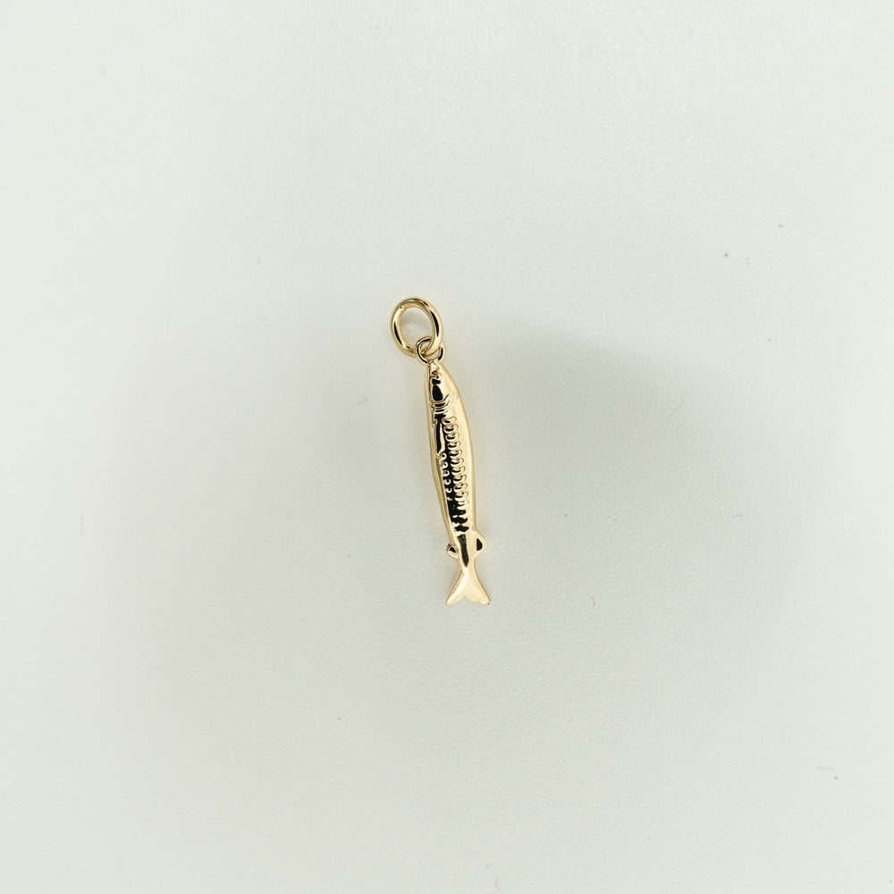 Sleek Sardine fish Charm. A coastal inspired fish charm with delicate details. Crafted in gold fill, high quality, hypoallergenic, and suitable for everyday wear.